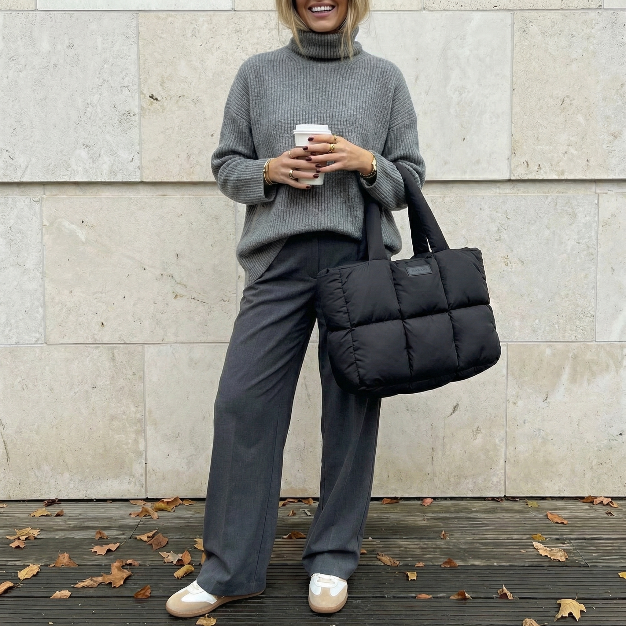 Erlebe die perfekte Kombination aus weichem Komfort und urbanem Stil: Die MALIA Black überzeugt durch ihre wattierte Steppoptik, das federleichte Tragegefühl und ihr klares, minimalistisches Design. In elegantem Schwarz gehalten, passt sie sich deinem Alltag flexibel an – ob im Büro, beim Stadtbummel oder auf Reisen.