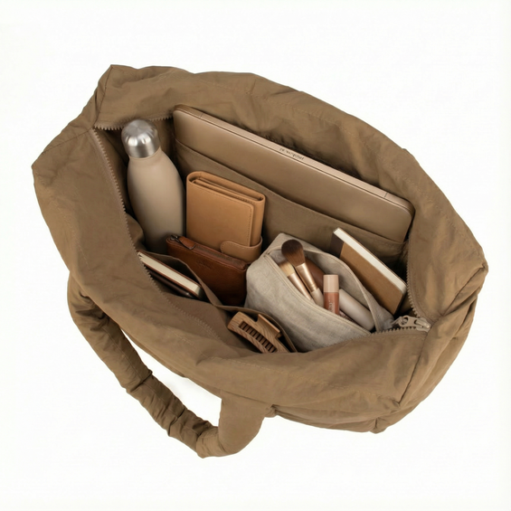 Das wattierte, vegane Material liegt angenehm weich in der Hand, während die gepolsterten Tragehenkel dir optimalen Komfort bieten. Ob zum Mantel, Blazer oder Strick – dieser warme Farbton ergänzt deine Garderobe perfekt.